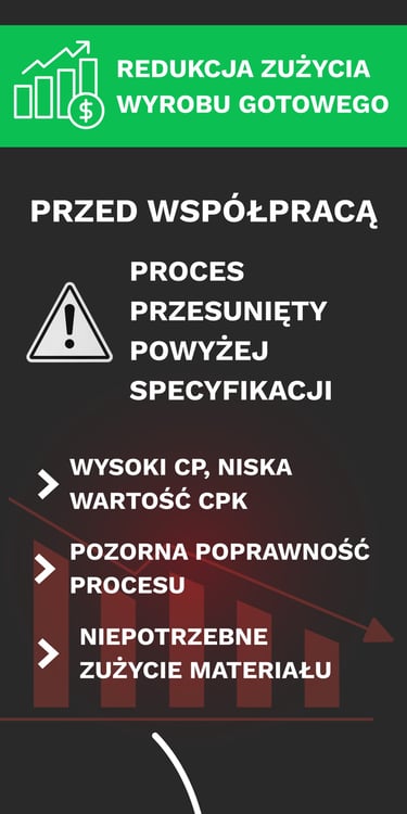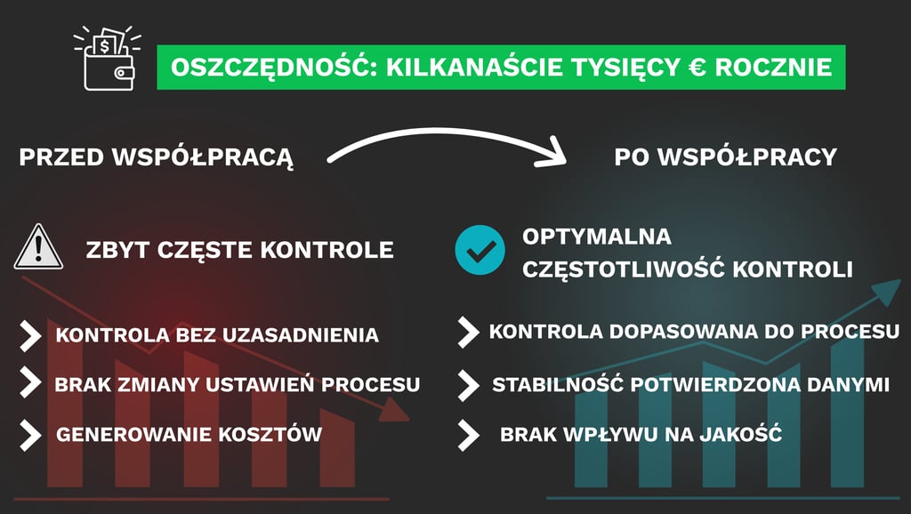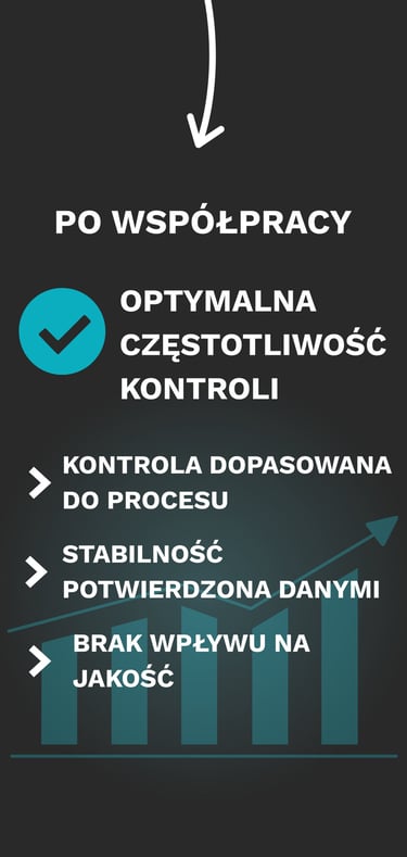 Zaczęliśmy od pytania o sens częstotliwości kontroli, a następnie wykonaliśmy analizę stabilności i zdolności procesu. Na podstawie danych wykazaliśmy, że można bezpiecznie ograniczyć liczbę badań bez zwiększania ryzyka dla klienta.